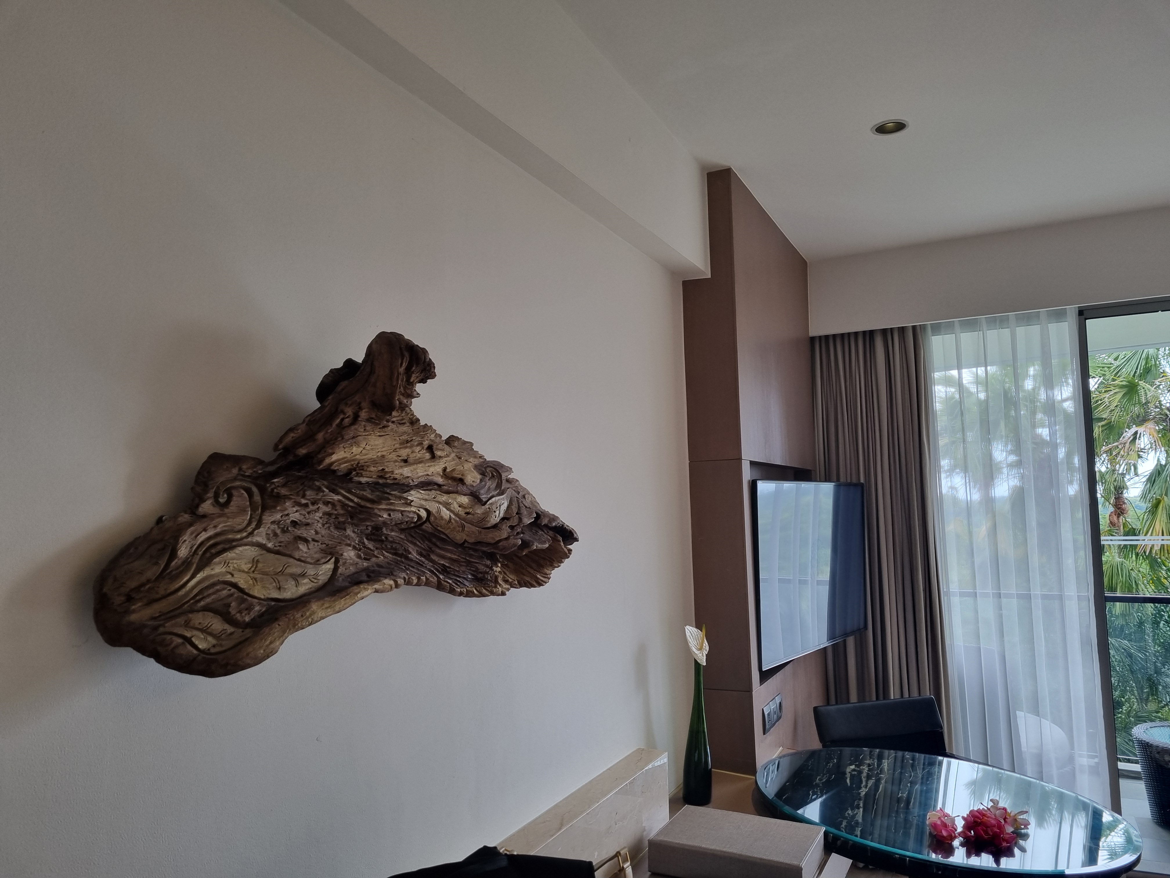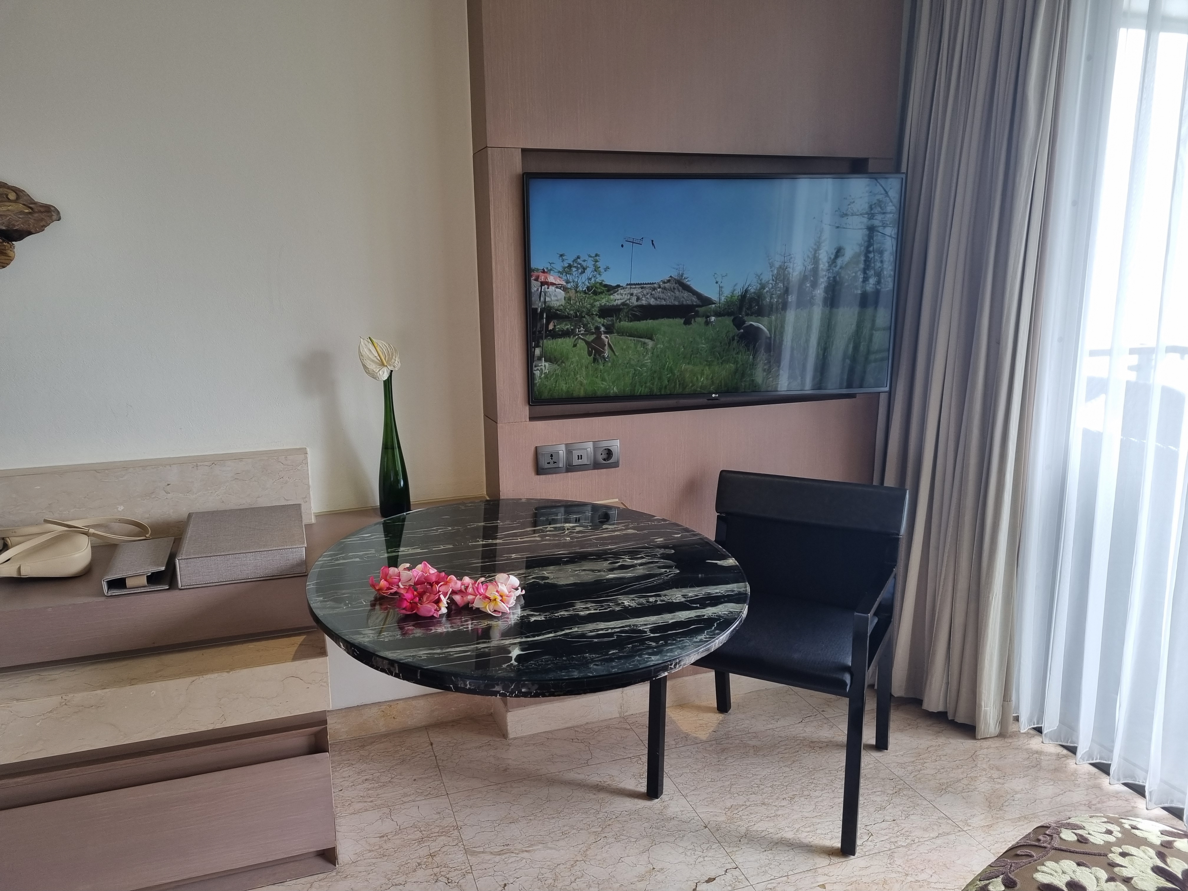 목에 걸린 꽃목걸이 보이실까요? 호텔에 들어서면 환영한다는 의미로 징을 울려주시고 꽃목걸이도 걸어 주십니다.