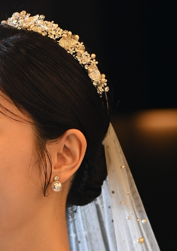 저는 낮은 티아라를 선택했습니다. 귀걸이는 실크에 잘 어울리는 진주귀걸이를 선택했습니다.