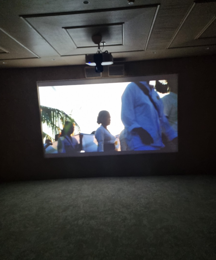 헤드셋을 끼고 영상을 시청합니다. 한국어로 들을 수 있습니다.