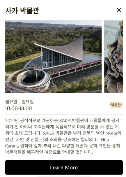 아야나 리조트 내에 위치한 사카 뮤지엄(Saka Museum)은 발리의 풍부한 문화와 예술을 소개하는 박물관입니다. 이 박물관은 전통 예술품과 현대 미술 작품을 함께 전시하며, 방문객들에게 발리의 역사와 문화를 깊이 이해할 수 있는 기회를 제공합니다