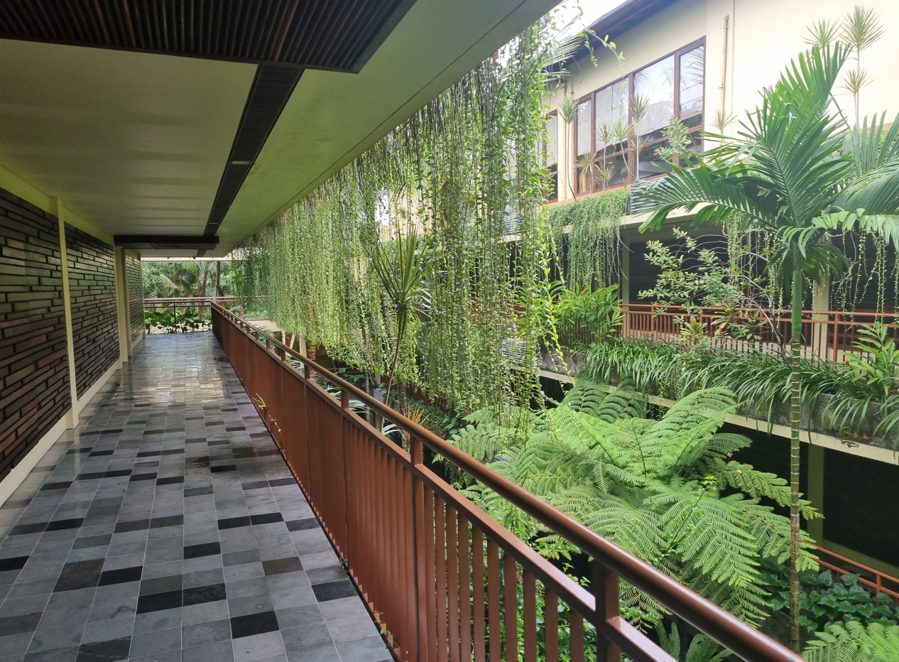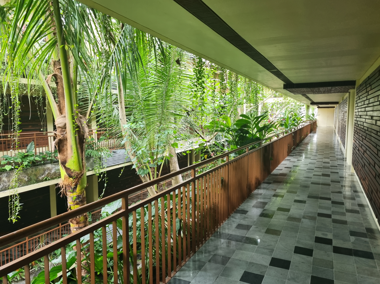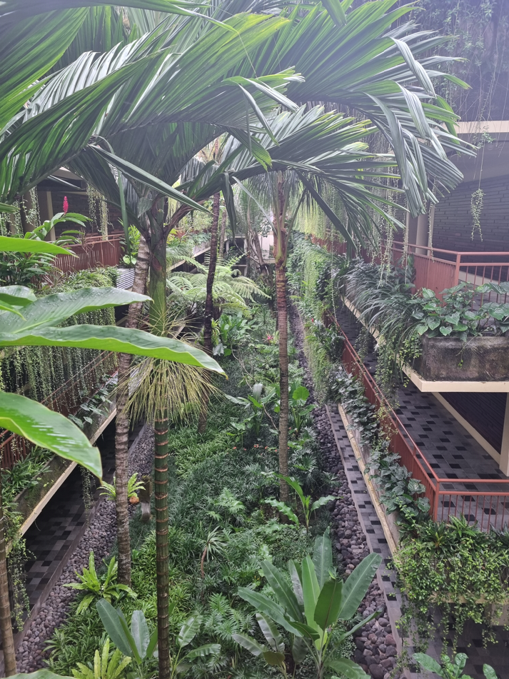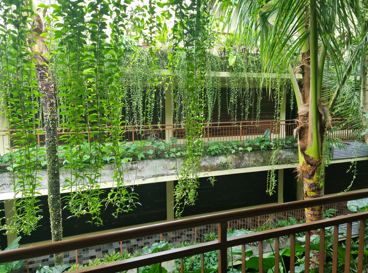 아침 조식을 먹으러 가는 길 호텔 복도입니다. 호텔의 우거진 풀숲이 너무 멋 있었습니다.