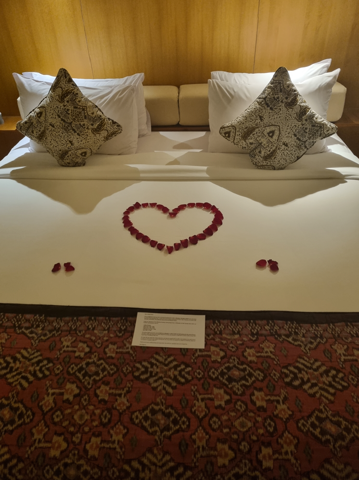 침대에 하트 꽃잎은 예약할 때 저희가 허니문이라 하여 준비를 해주신 것 같습니다.