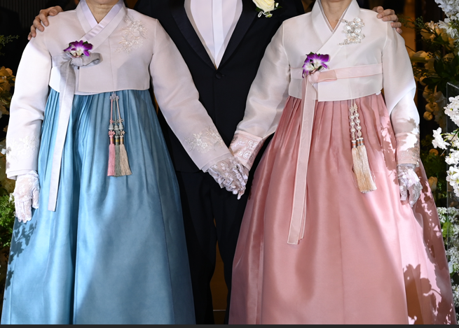 혼주 한복의 경우 보통 신부 쪽은 핑크, 신랑 쪽은 파랑 계통으로 저고리나 색상을 통일 많이 하시죠 저희는 치마색을 통일하기로 하였습니다.