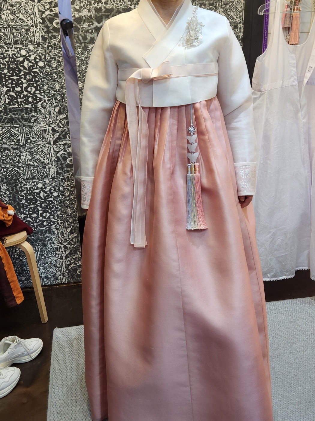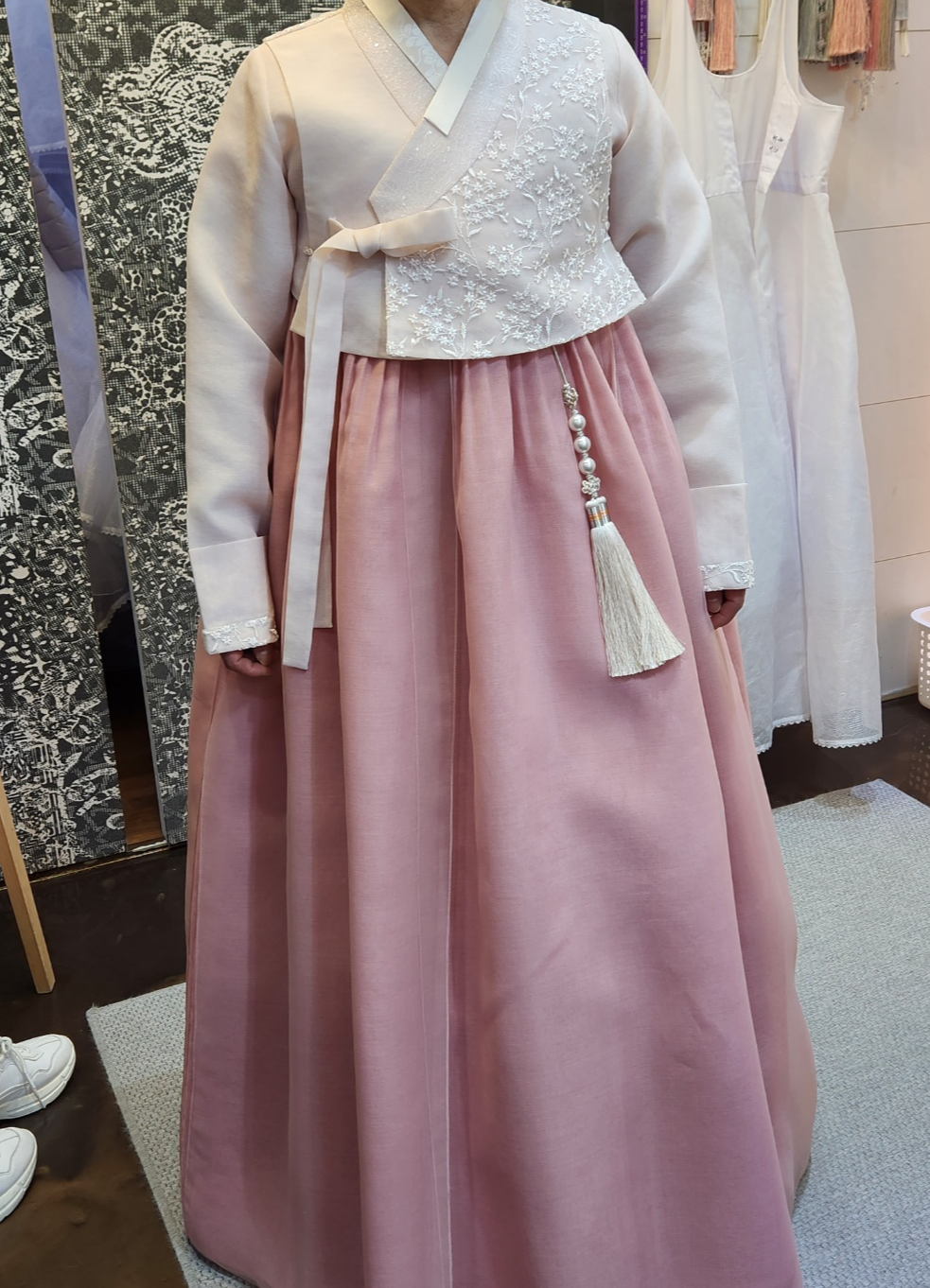 다음 한복입니다. 핑크 계열 저고리와 치마는 베이지 톤에 꽃자수가 예뻤습니다.